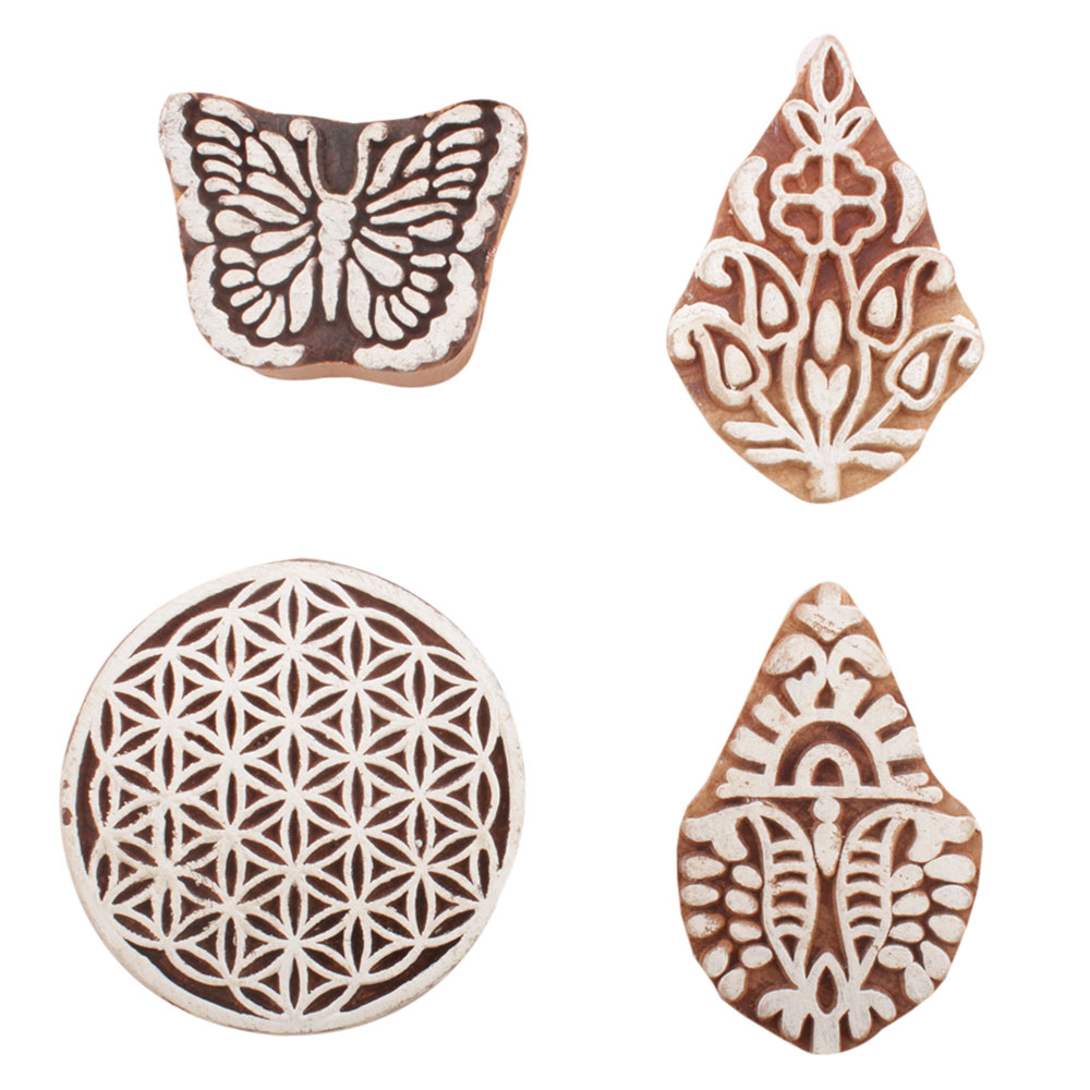Set of 4 Piece New Mix Wooden Printing Block. Ideal for use on Fabric, Paper, Canvas, etc. These Blocks can be use to Print with Oil Colors, Fabric Colors, Water Colors, Acrylic Colors and Vegetable Colors.