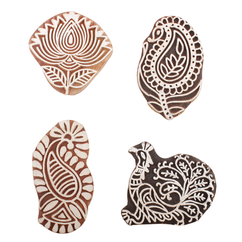 Set of 4 Piece New Mix Wooden Printing Block. Ideal for use on Fabric, Paper, Canvas, etc. These Blocks can be use to Print with Oil Colors, Fabric Colors, Water Colors, Acrylic Colors and Vegetable Colors.