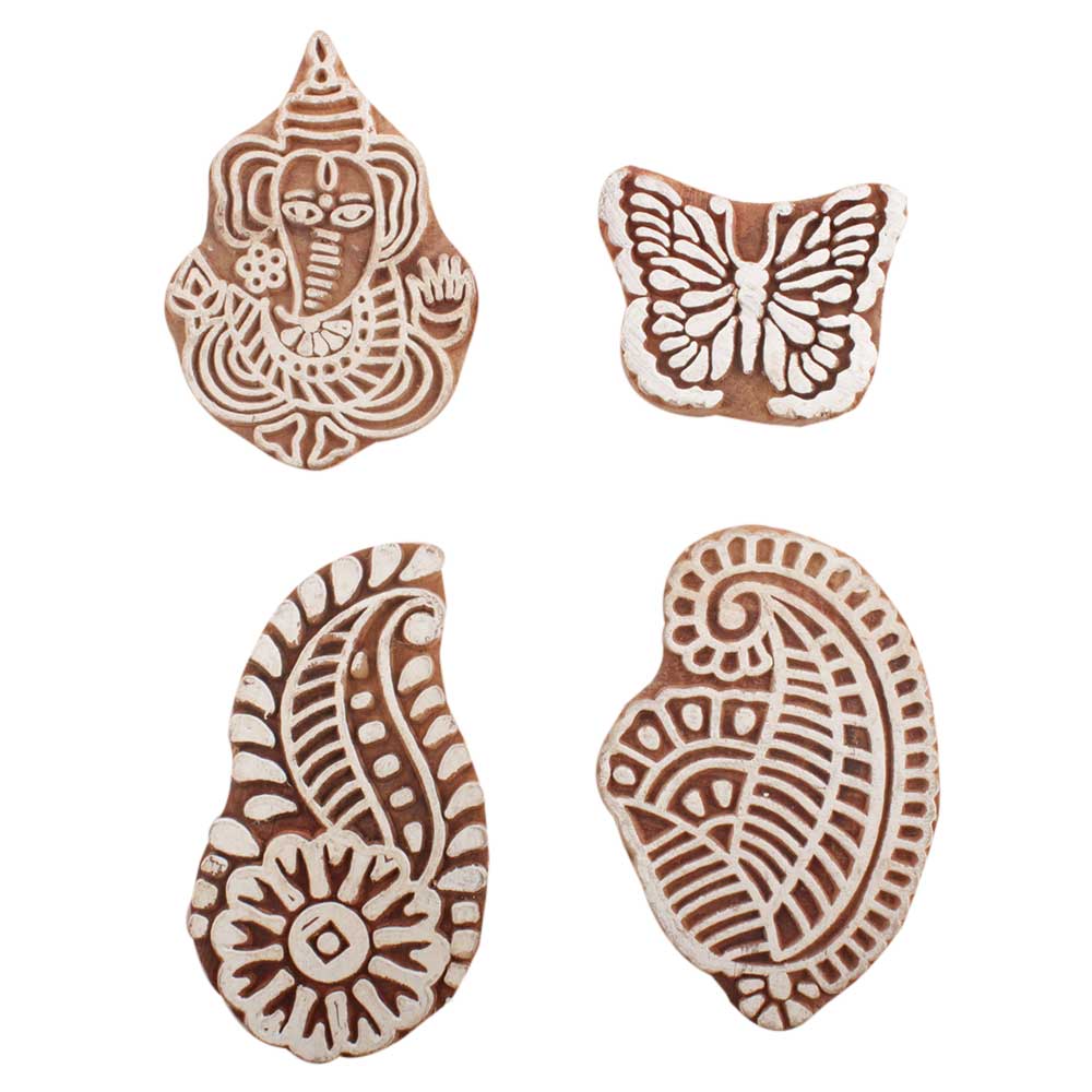 Set of 4 Piece New Mix Wooden Printing Block. Ideal for use on Fabric, Paper, Canvas, etc. These Blocks can be use to Print with Oil Colors, Fabric Colors, Water Colors, Acrylic Colors and Vegetable Colors.