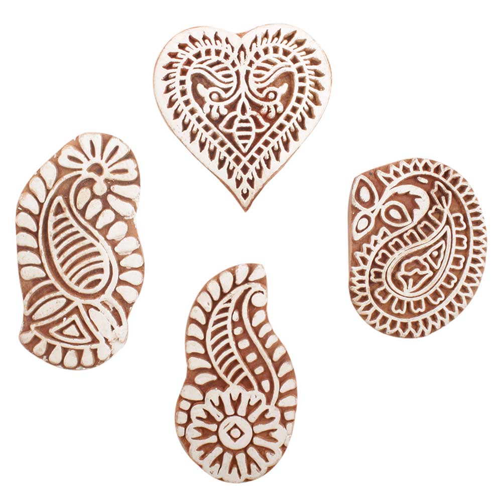 Set of 4 Piece New Mix Wooden Printing Block. Ideal for use on Fabric, Paper, Canvas, etc. These Blocks can be use to Print with Oil Colors, Fabric Colors, Water Colors, Acrylic Colors and Vegetable Colors.