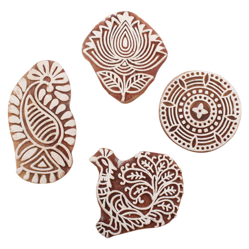 Set of 4 Piece New Mix Wooden Printing Block. Ideal for use on Fabric, Paper, Canvas, etc. These Blocks can be use to Print with Oil Colors, Fabric Colors, Water Colors, Acrylic Colors and Vegetable Colors.