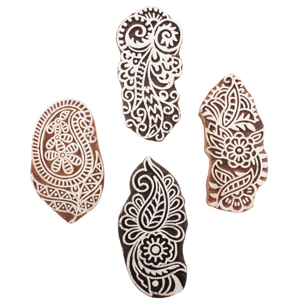 Set of 4 Piece New Mix Wooden Printing Block. Ideal for use on Fabric, Paper, Canvas, etc. These Blocks can be use to Print with Oil Colors, Fabric Colors, Water Colors, Acrylic Colors and Vegetable Colors.