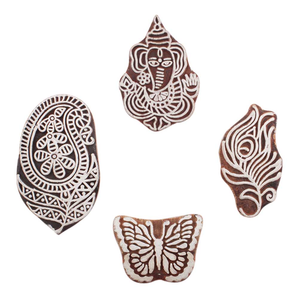 Set of 4 Piece New Mix Wooden Printing Block. Ideal for use on Fabric, Paper, Canvas, etc. These Blocks can be use to Print with Oil Colors, Fabric Colors, Water Colors, Acrylic Colors and Vegetable Colors.