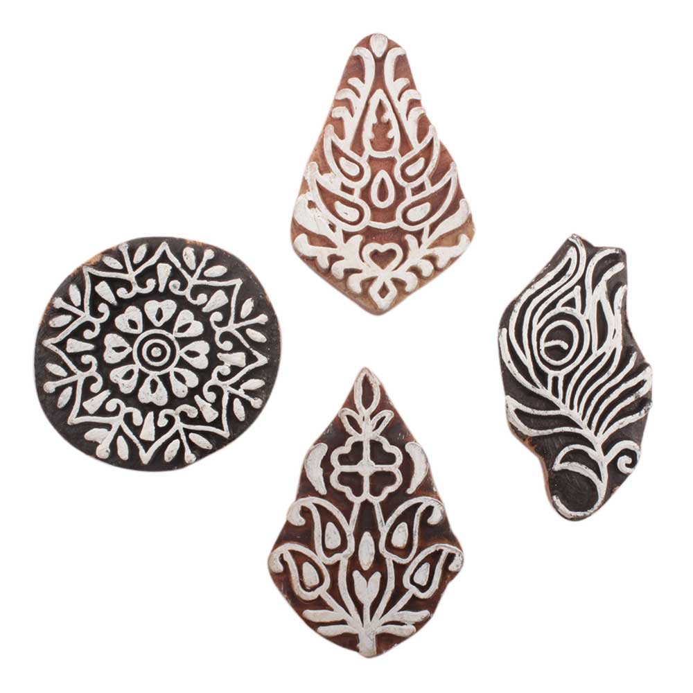 Set of 4 Piece New Mix Wooden Printing Block. Ideal for use on Fabric, Paper, Canvas, etc. These Blocks can be use to Print with Oil Colors, Fabric Colors, Water Colors, Acrylic Colors and Vegetable Colors.