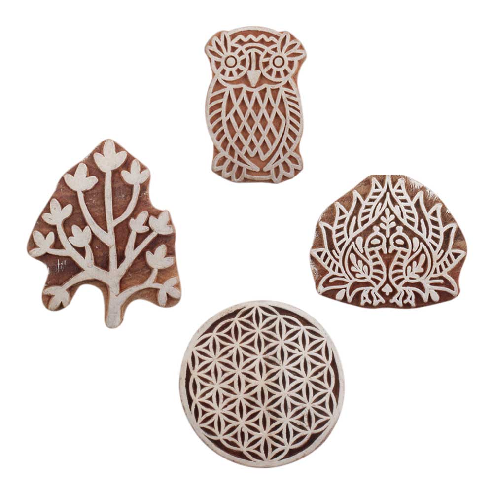 Set of 4 Piece New Mix Wooden Printing Block. Ideal for use on Fabric, Paper, Canvas, etc. These Blocks can be use to Print with Oil Colors, Fabric Colors, Water Colors, Acrylic Colors and Vegetable Colors.