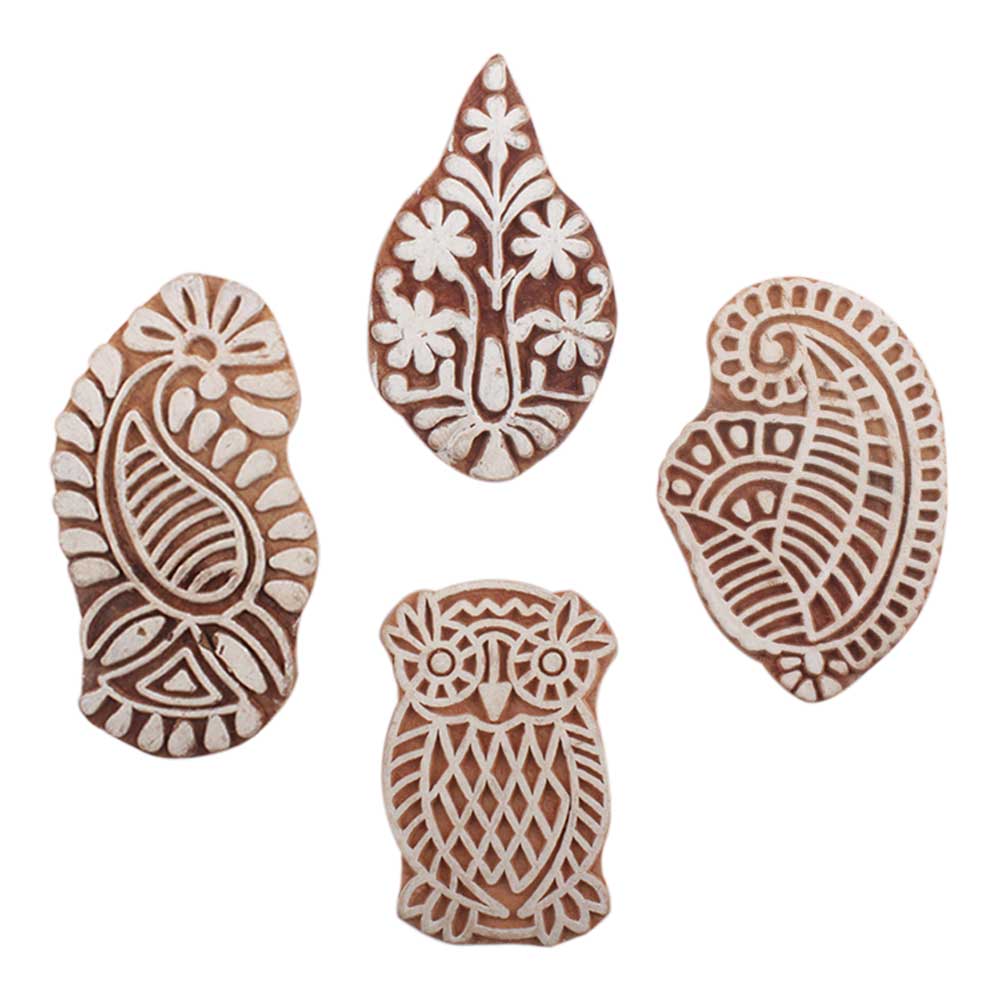Set of 4 Piece New Mix Wooden Printing Block. Ideal for use on Fabric, Paper, Canvas, etc. These Blocks can be use to Print with Oil Colors, Fabric Colors, Water Colors, Acrylic Colors and Vegetable Colors.