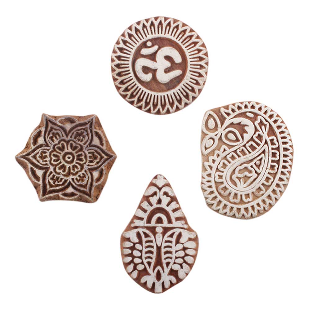 Set of 4 Piece New Mix Wooden Printing Block. Ideal for use on Fabric, Paper, Canvas, etc. These Blocks can be use to Print with Oil Colors, Fabric Colors, Water Colors, Acrylic Colors and Vegetable Colors.