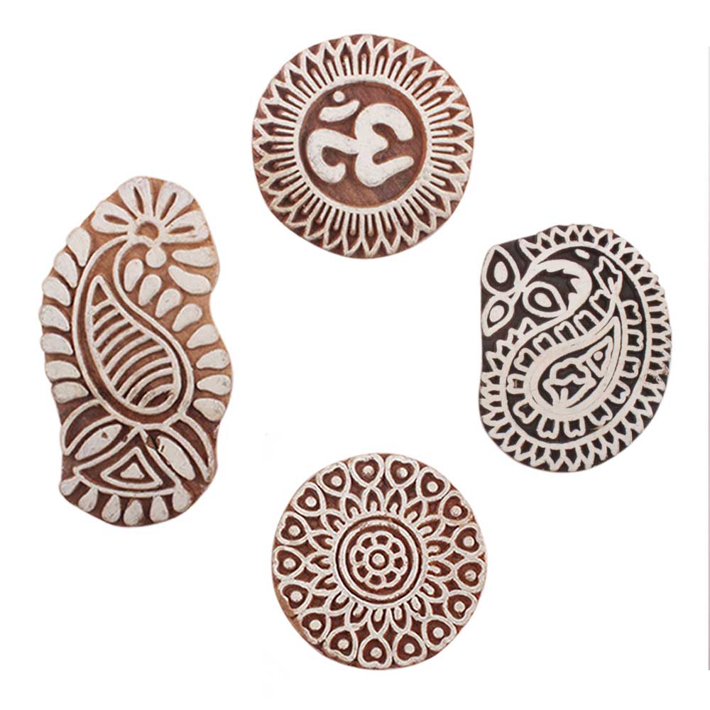 Set of 4 Piece New Mix Wooden Printing Block. Ideal for use on Fabric, Paper, Canvas, etc. These Blocks can be use to Print with Oil Colors, Fabric Colors, Water Colors, Acrylic Colors and Vegetable Colors.