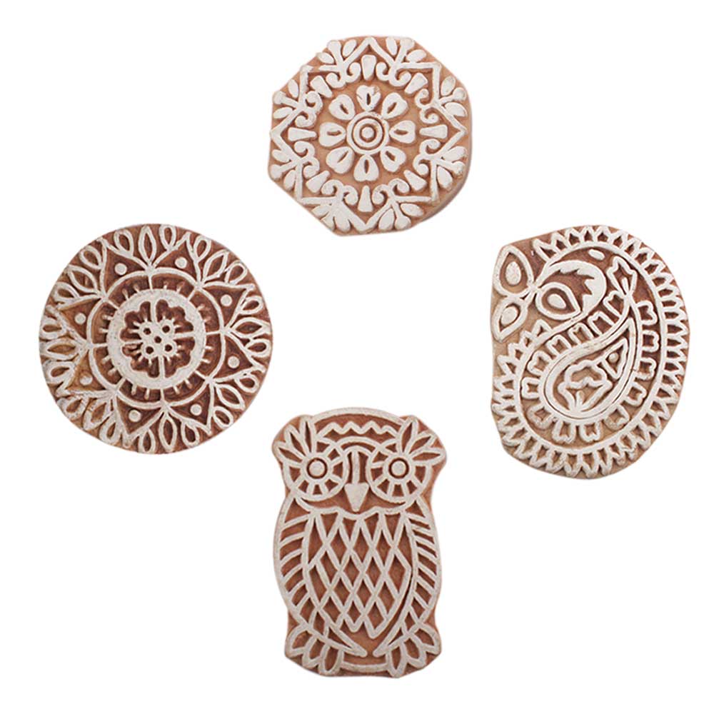 Set of 4 Piece New Mix Wooden Printing Block. Ideal for use on Fabric, Paper, Canvas, etc. These Blocks can be use to Print with Oil Colors, Fabric Colors, Water Colors, Acrylic Colors and Vegetable Colors.