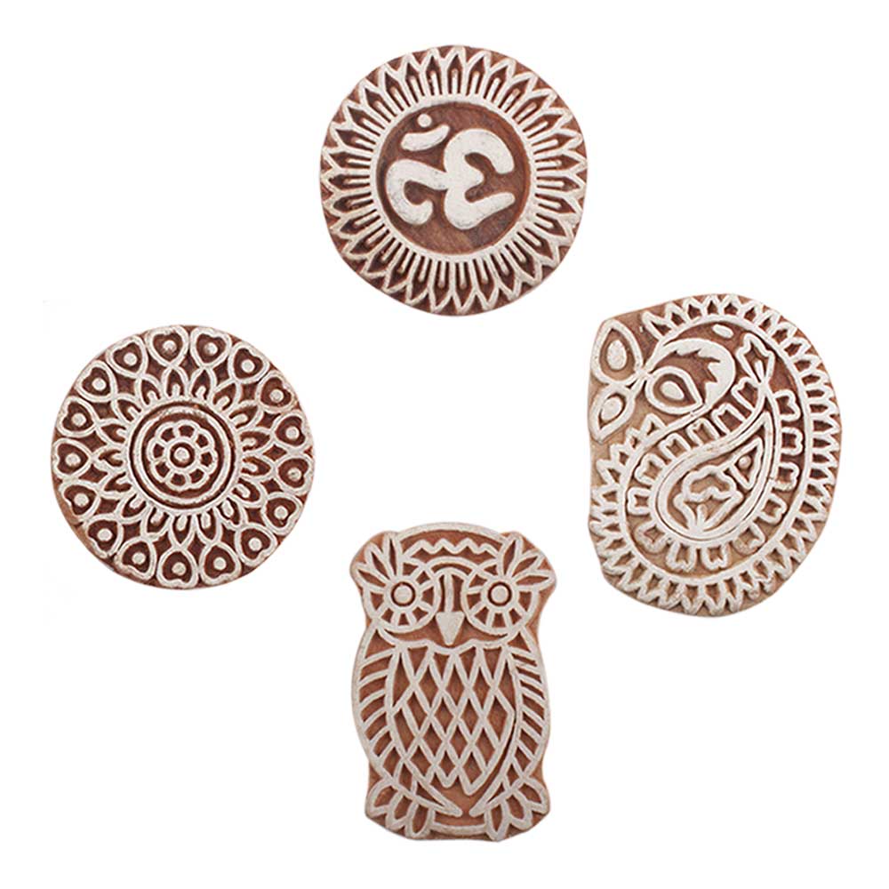 Set of 4 Piece New Mix Wooden Printing Block. Ideal for use on Fabric, Paper, Canvas, etc. These Blocks can be use to Print with Oil Colors, Fabric Colors, Water Colors, Acrylic Colors and Vegetable Colors.