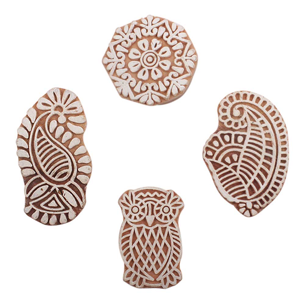Set of 4 Piece New Mix Wooden Printing Block. Ideal for use on Fabric, Paper, Canvas, etc. These Blocks can be use to Print with Oil Colors, Fabric Colors, Water Colors, Acrylic Colors and Vegetable Colors.
