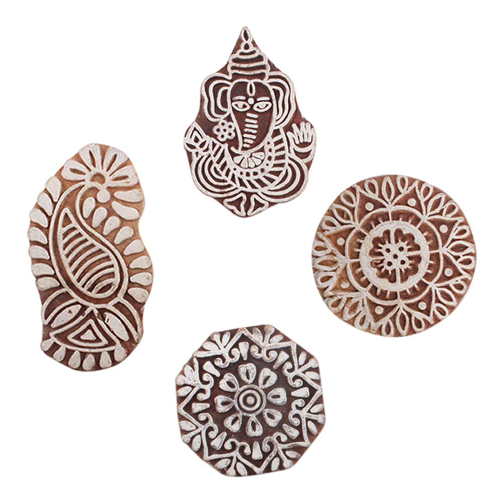 Set of 4 Piece New Mix Wooden Printing Block. Ideal for use on Fabric, Paper, Canvas, etc. These Blocks can be use to Print with Oil Colors, Fabric Colors, Water Colors, Acrylic Colors and Vegetable Colors.