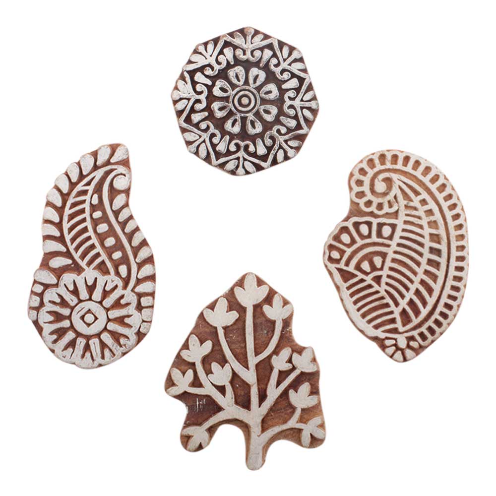 Set of 4 Piece New Mix Wooden Printing Block. Ideal for use on Fabric, Paper, Canvas, etc. These Blocks can be use to Print with Oil Colors, Fabric Colors, Water Colors, Acrylic Colors and Vegetable Colors.