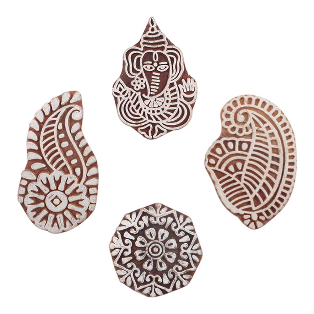 Set of 4 Piece New Mix Wooden Printing Block. Ideal for use on Fabric, Paper, Canvas, etc. These Blocks can be use to Print with Oil Colors, Fabric Colors, Water Colors, Acrylic Colors and Vegetable Colors.