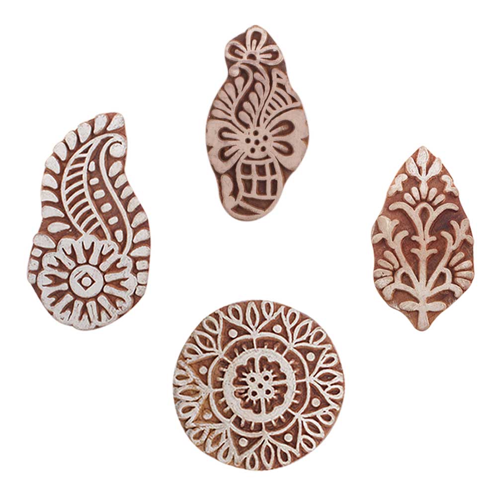 Set of 4 Piece New Mix Wooden Printing Blocks. Ideal for use on Fabric, Paper, Canvas, etc. These Blocks can be use to Print with Oil Colors, Fabric Colors, Water Colors, Acrylic Colors and Vegetable Colors.