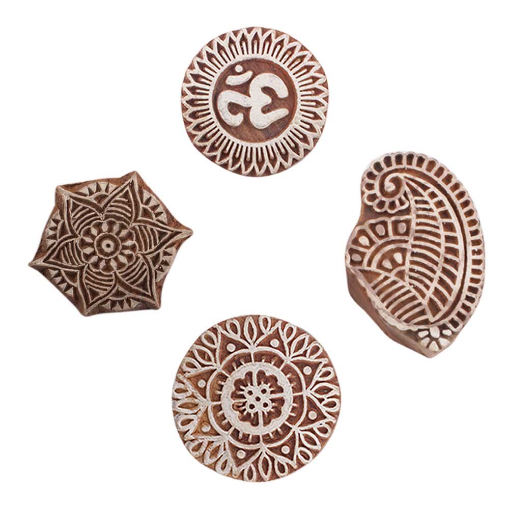 Set of 4 Piece New Mix Wooden Printing Blocks. Ideal for use on Fabric, Paper, Canvas, etc. These Blocks can be use to Print with Oil Colors, Fabric Colors, Water Colors, Acrylic Colors and Vegetable Colors.