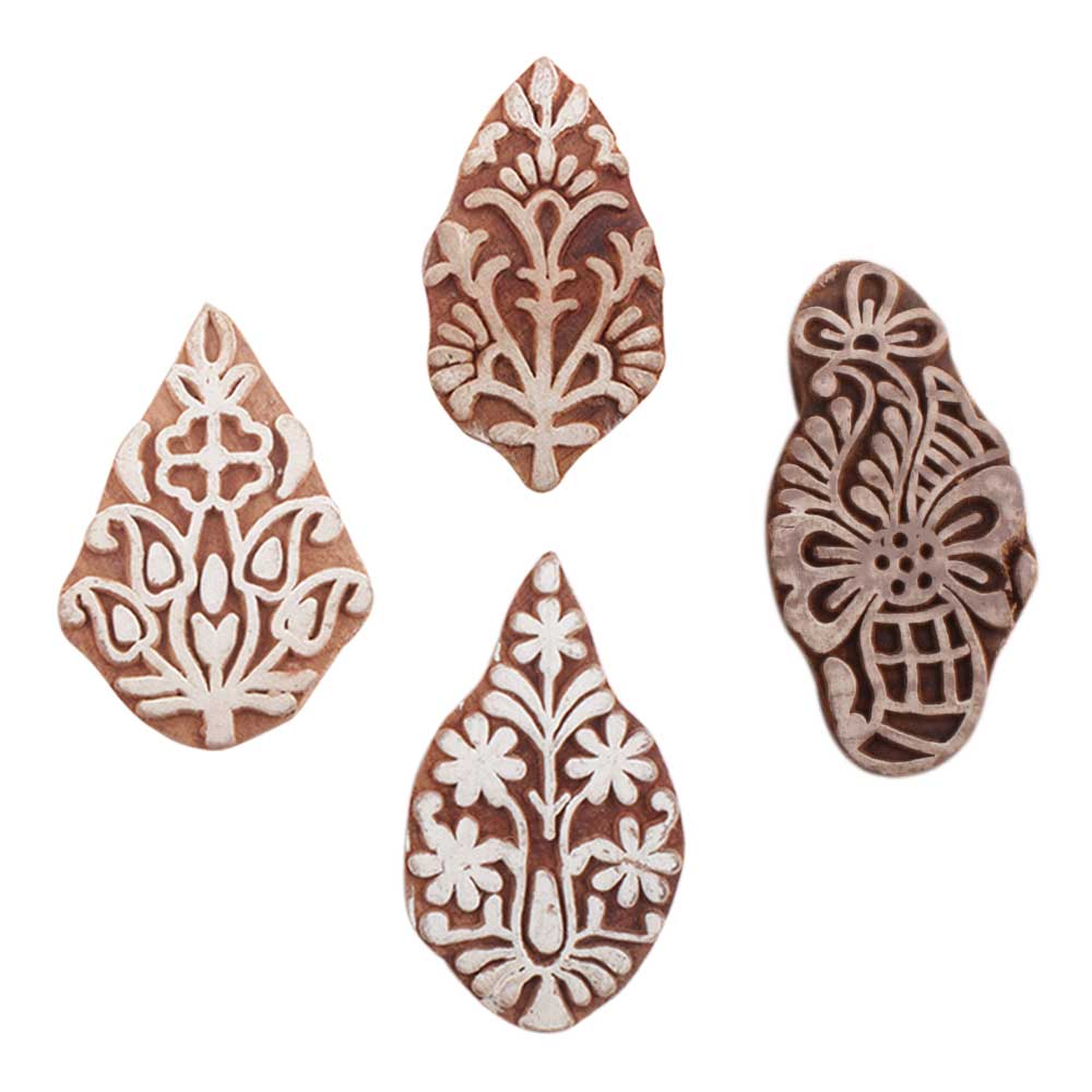 Set of 4 Piece New Mix Wooden Printing Blocks. Ideal for use on Fabric, Paper, Canvas, etc. These Blocks can be use to Print with Oil Colors, Fabric Colors, Water Colors, Acrylic Colors and Vegetable Colors.