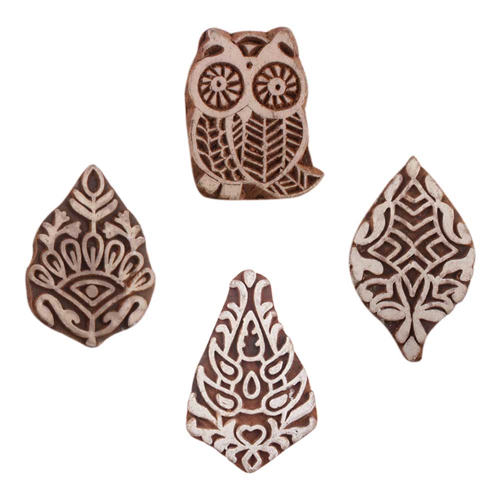 Set of 4 Piece New Mix Wooden Printing Blocks. Ideal for use on Fabric, Paper, Canvas, etc. These Blocks can be use to Print with Oil Colors, Fabric Colors, Water Colors, Acrylic Colors and Vegetable Colors.