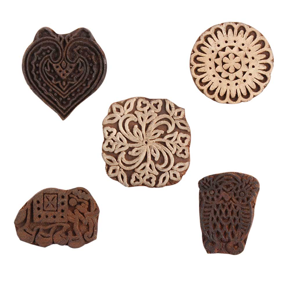 Set of 5 Piece New Mix Wooden Printing Block. Ideal for Using on Fabric, Paper, Canvas, etc. These Blocks can be use to Print with Oil Colors, Fabric Colors, Water Colors, Acrylic Colors and Vegetable Colors.