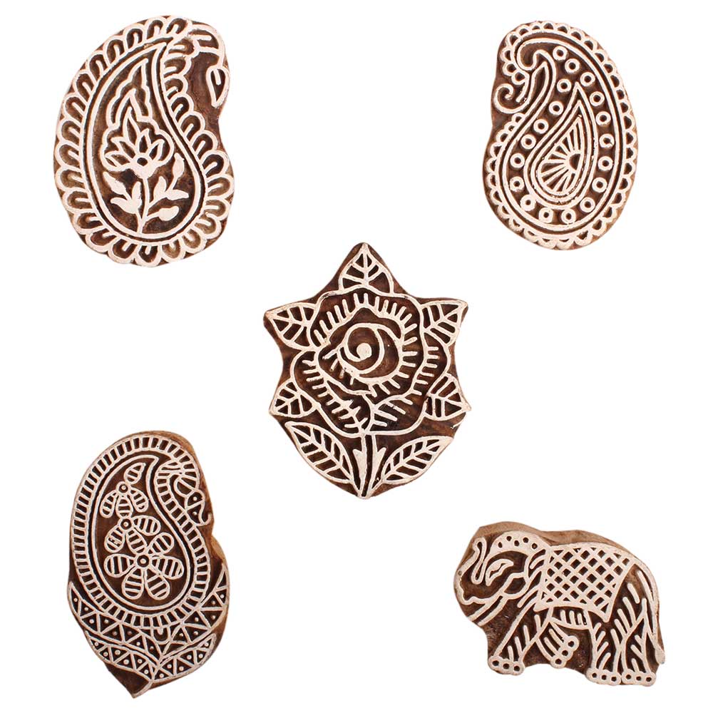 Set of 5 Piece New Mix Wooden Printing Block. Ideal for use on Fabric, Paper, Canvas, etc. These Blocks can be use to Print with Oil Colors, Fabric Colors, Water Colors, Acrylic Colors and Vegetable Colors.