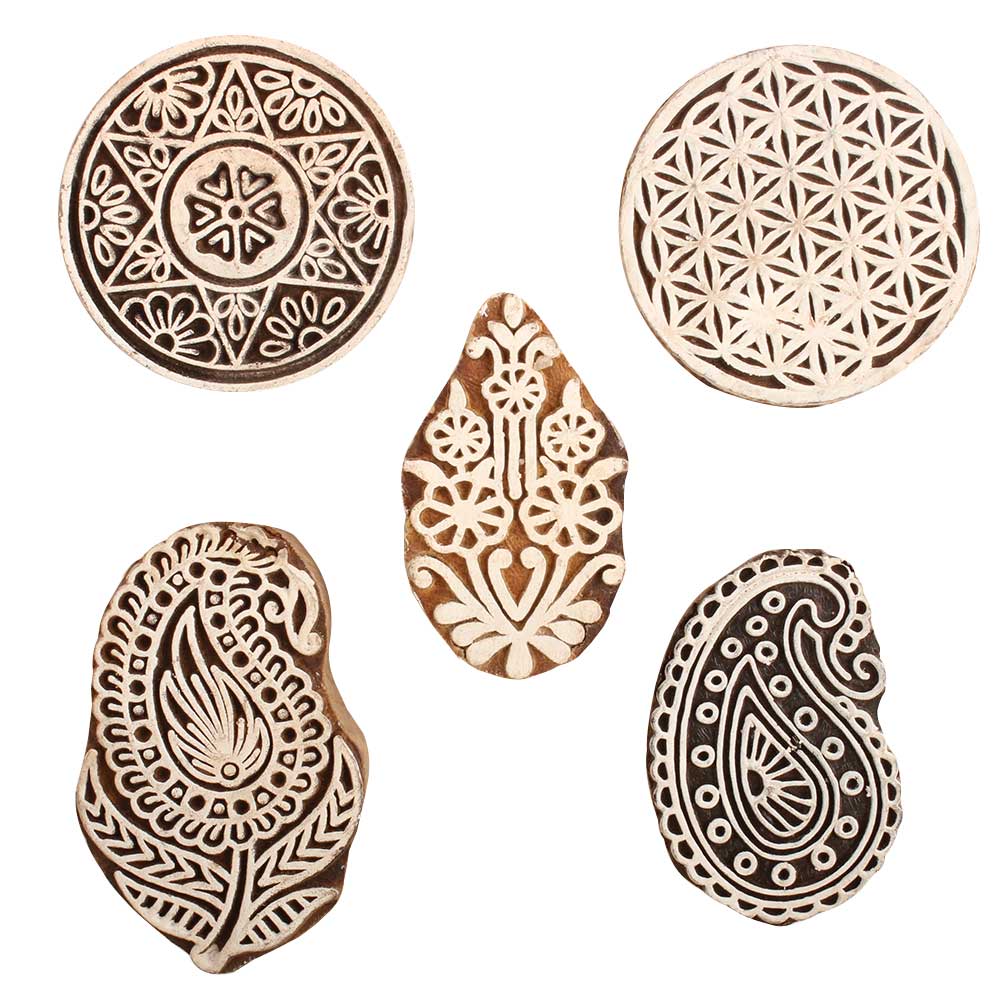 Set of 5 Piece New Mix Wooden Printing Block. Ideal for use on Fabric, Paper, Canvas, etc. These Blocks can be use to Print with Oil Colors, Fabric Colors, Water Colors, Acrylic Colors and Vegetable Colors.