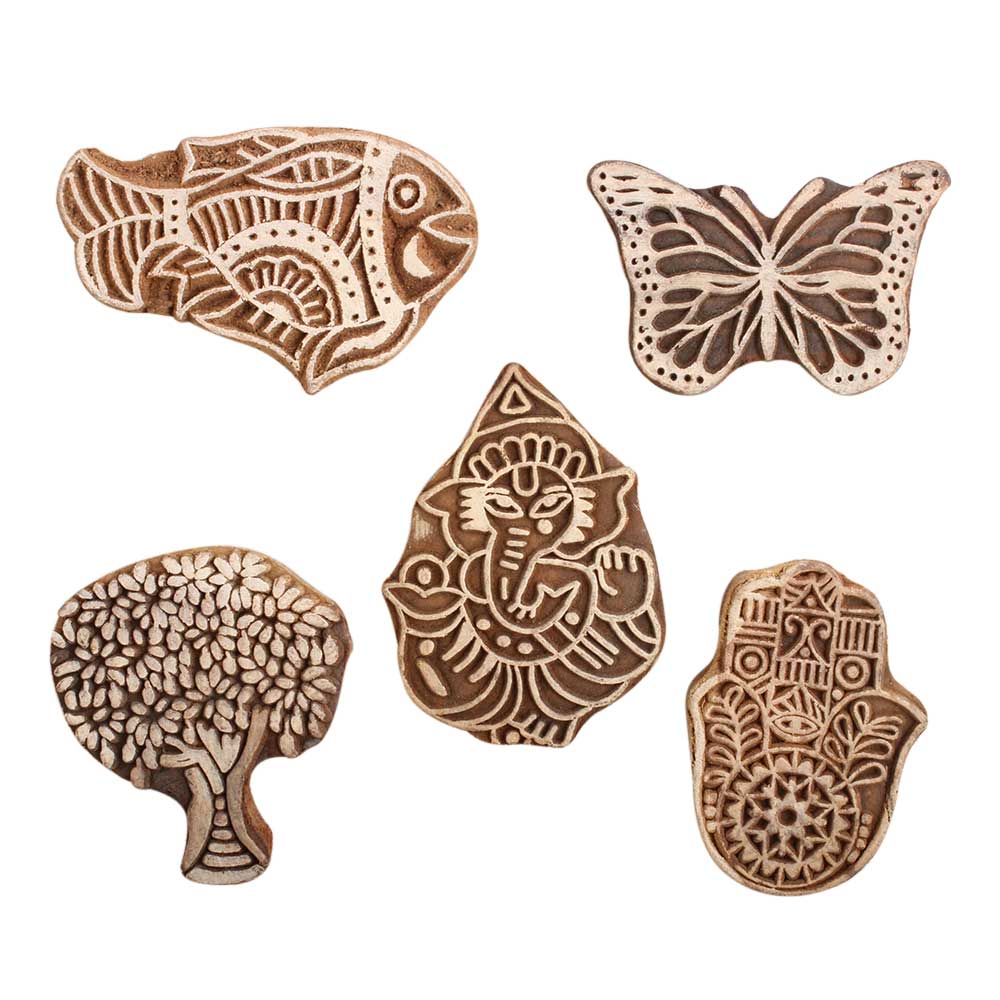 Set of 5 Piece New Mix Wooden Printing Block. Ideal for use on Fabric, Paper, Canvas, etc. These Blocks can be use to Print with Oil Colors, Fabric Colors, Water Colors, Acrylic Colors and Vegetable Colors.