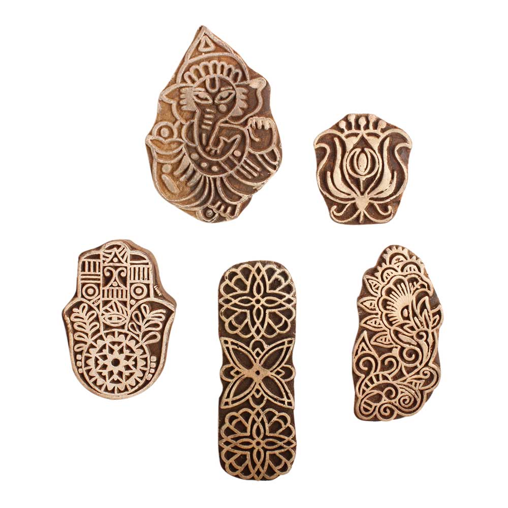Set of 5 Piece New Mix Wooden Printing Block. Ideal for use on Fabric, Paper, Canvas, etc. These Blocks can be use to Print with Oil Colors, Fabric Colors, Water Colors, Acrylic Colors and Vegetable Colors.