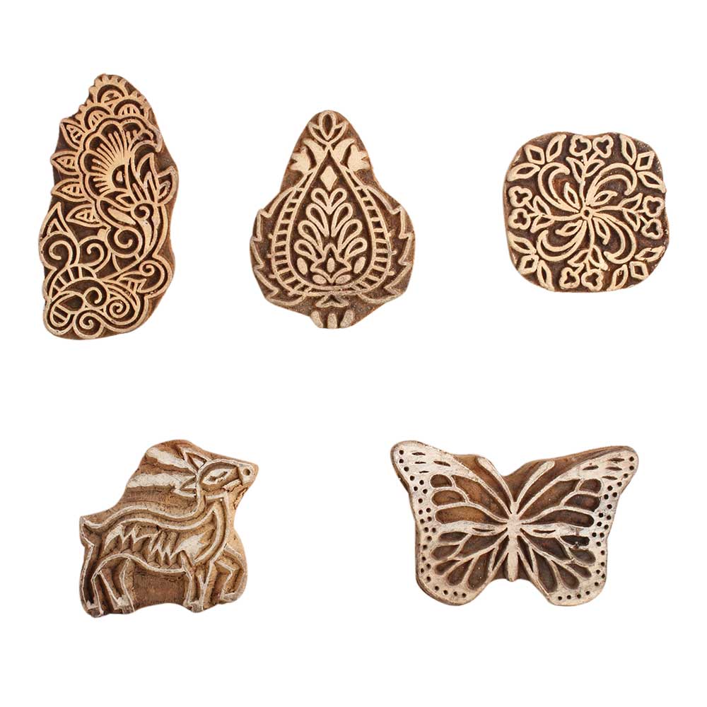 Set of 5 Piece New Mix Wooden Printing Block. Ideal for use on Fabric, Paper, Canvas, etc. These Blocks can be use to Print with Oil Colors, Fabric Colors, Water Colors, Acrylic Colors and Vegetable Colors.