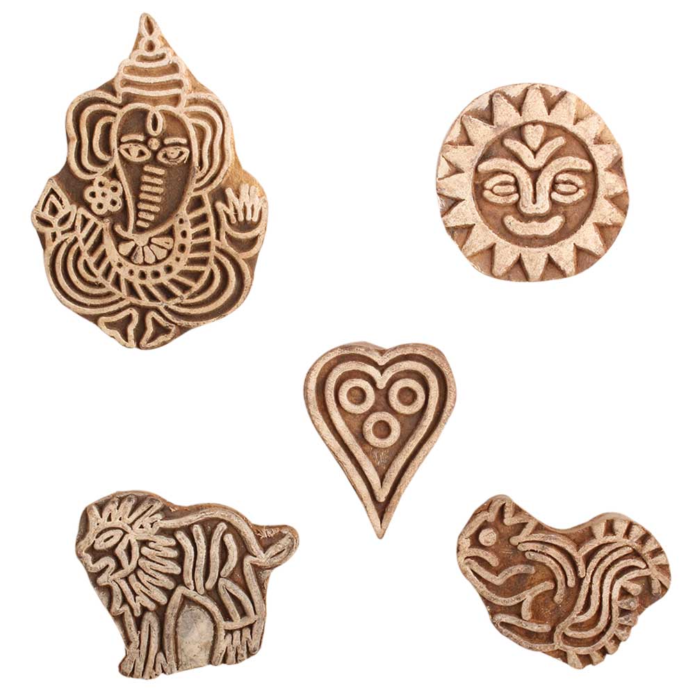Set of 5 Piece New Mix Wooden Printing Block. Ideal for use on Fabric, Paper, Canvas, etc. These Blocks can be use to Print with Oil Colors, Fabric Colors, Water Colors, Acrylic Colors and Vegetable Colors.