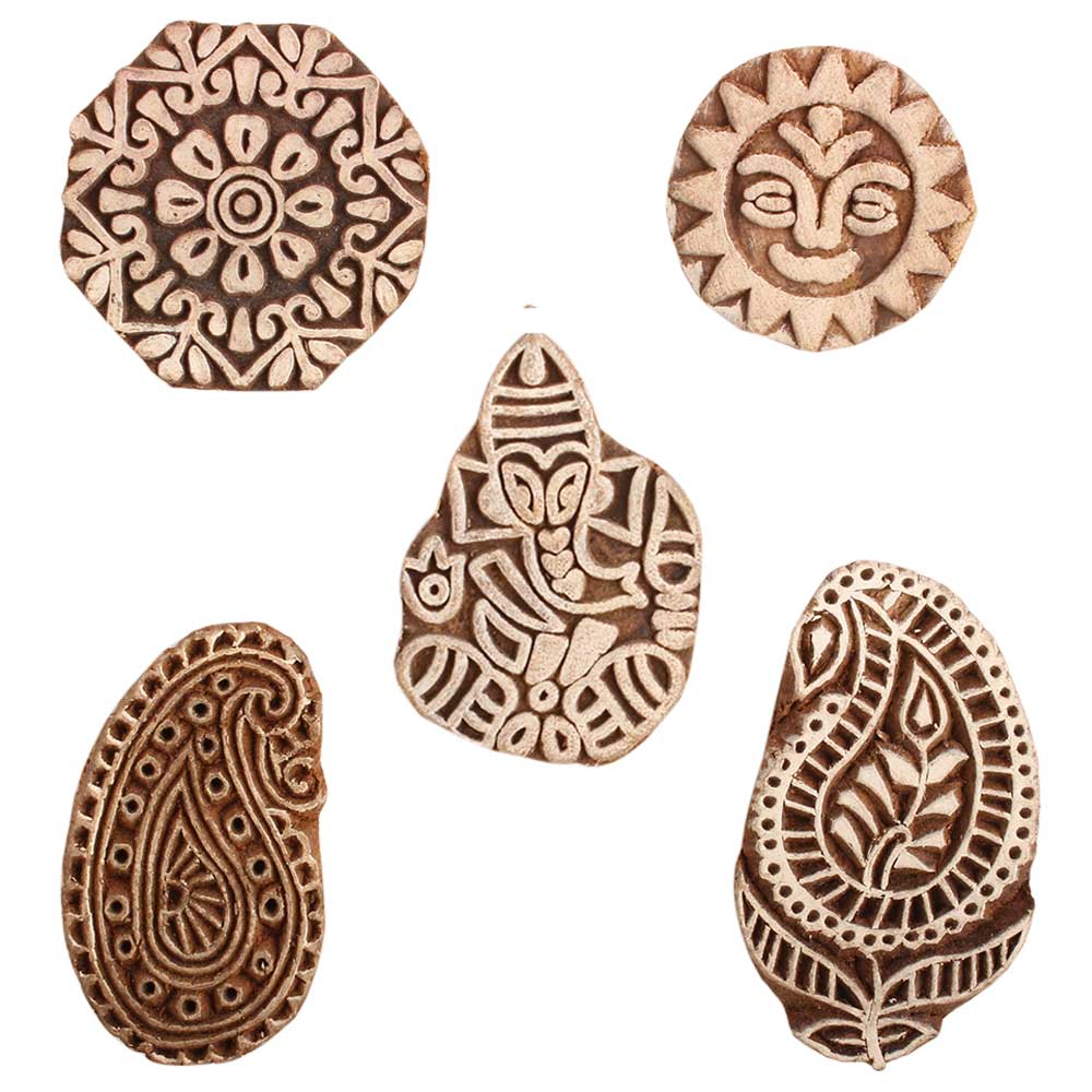 Set of 5 Piece New Mix Wooden Printing Block. Ideal for use on Fabric, Paper, Canvas, etc. These Blocks can be use to Print with Oil Colors, Fabric Colors, Water Colors, Acrylic Colors and Vegetable Colors.