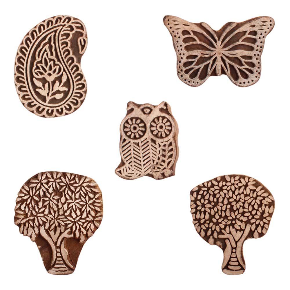 Set of 5 Piece New Mix Wooden Printing Block. Ideal for use on Fabric, Paper, Canvas, etc. These Blocks can be use to Print with Oil Colors, Fabric Colors, Water Colors, Acrylic Colors and Vegetable Colors.