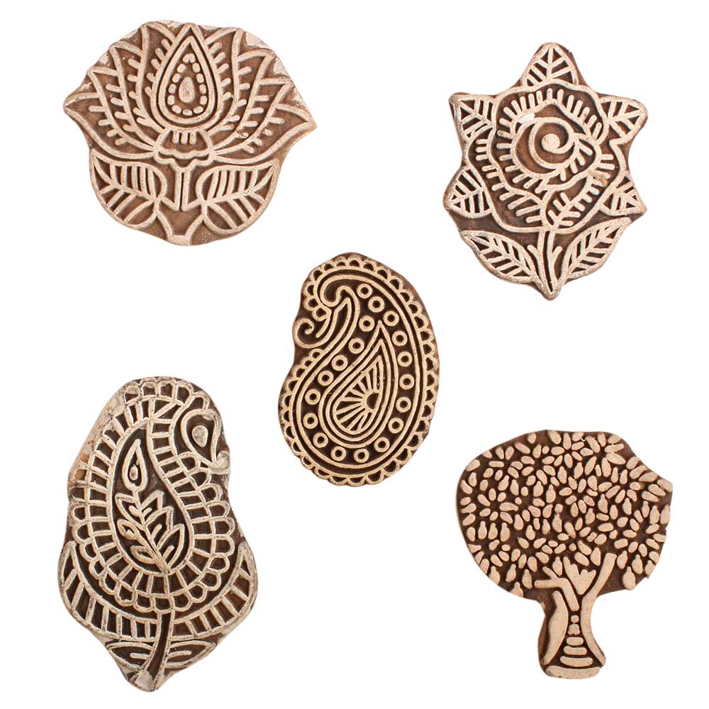 Set of 5 Piece New Mix Wooden Printing Block. Ideal for use on Fabric, Paper, Canvas, etc. These Blocks can be use to Print with Oil Colors, Fabric Colors, Water Colors, Acrylic Colors and Vegetable Colors.