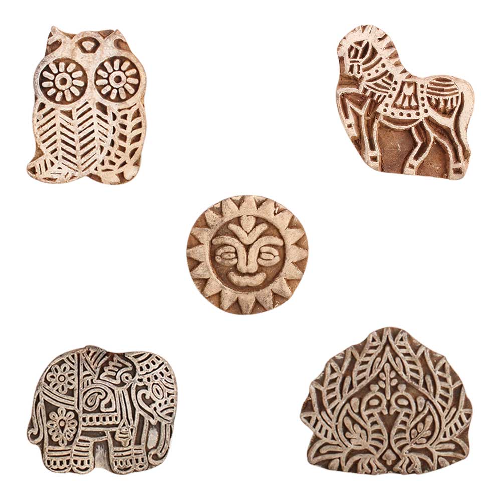 Set of 5 Piece New Mix Wooden Printing Block. Ideal for use on Fabric, Paper, Canvas, etc. These Blocks can be use to Print with Oil Colors, Fabric Colors, Water Colors, Acrylic Colors and Vegetable Colors.