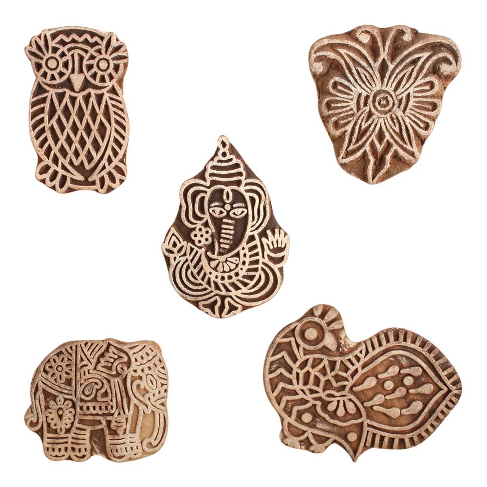 Set of 5 Piece New Mix Wooden Printing Block. Ideal for use on Fabric, Paper, Canvas, etc. These Blocks can be use to Print with Oil Colors, Fabric Colors, Water Colors, Acrylic Colors and Vegetable Colors.