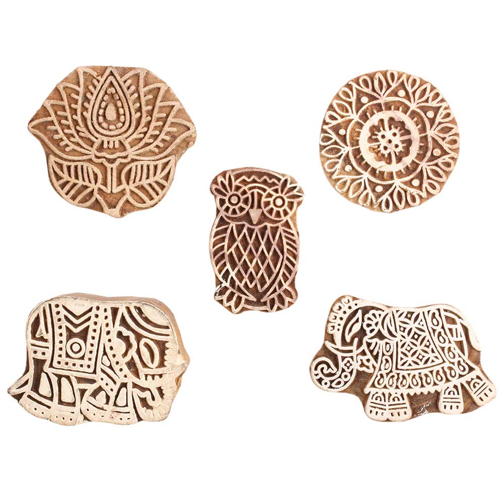 Set of 5 Piece New Mix Wooden Printing Block. Ideal for use on Fabric, Paper, Canvas, etc. These Blocks can be use to Print with Oil Colors, Fabric Colors, Water Colors, Acrylic Colors and Vegetable Colors.
