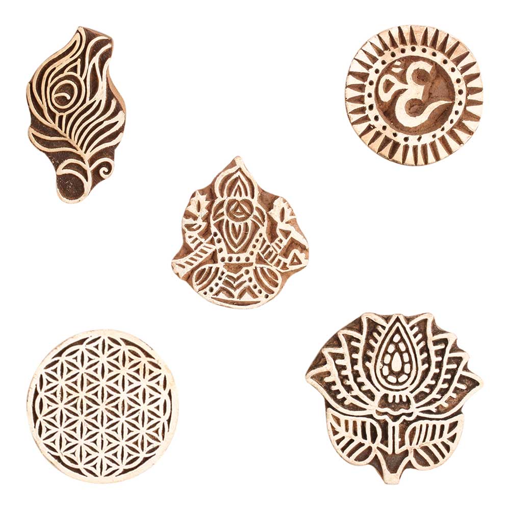 Set of 5 Piece New Mix Wooden Printing Block. Ideal for use on Fabric, Paper, Canvas, etc. These Blocks can be use to Print with Oil Colors, Fabric Colors, Water Colors, Acrylic Colors and Vegetable Colors.