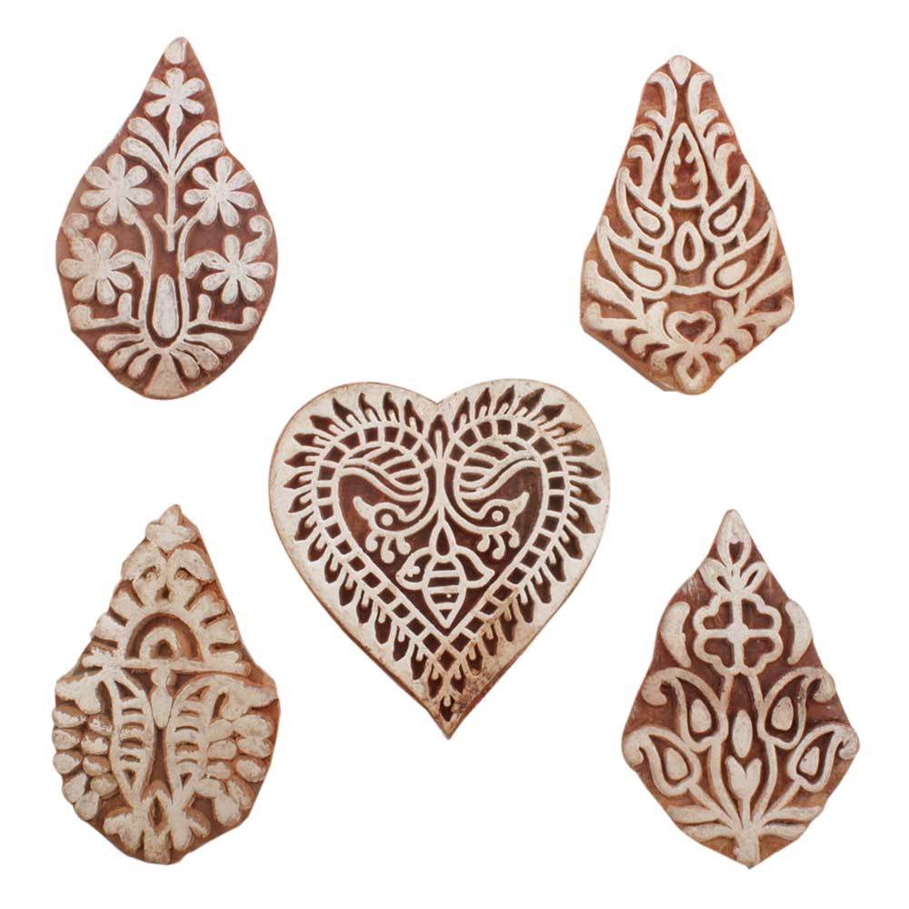 Set of 5 Piece New Mix Wooden Printing Blocks. Ideal for use on Fabric, Paper, Canvas, etc. These Blocks can be use to Print with Oil Colors, Fabric Colors, Water Colors, Acrylic Colors and Vegetable Colors.