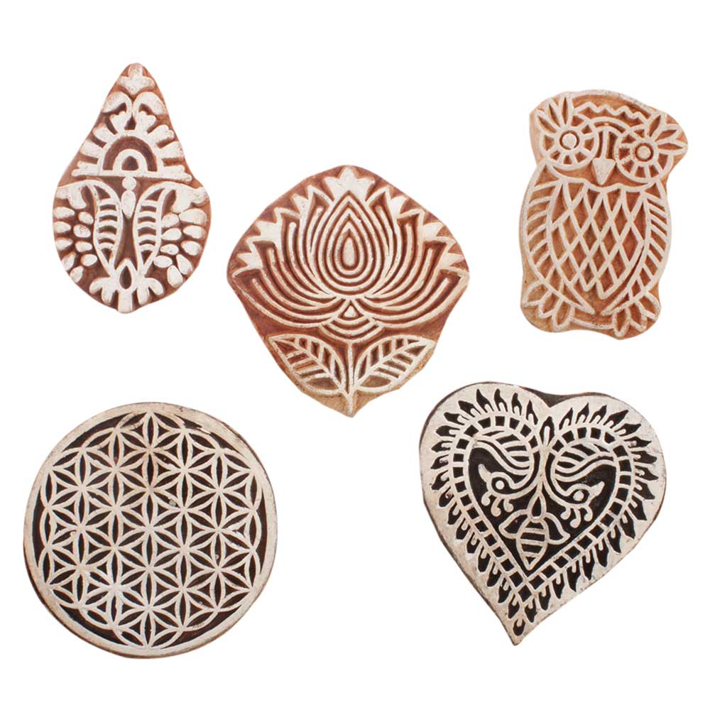 Set of 5 Piece New Mix Wooden Printing Blocks. Ideal for use on Fabric, Paper, Canvas, etc. These Blocks can be use to Print with Oil Colors, Fabric Colors, Water Colors, Acrylic Colors and Vegetable Colors.