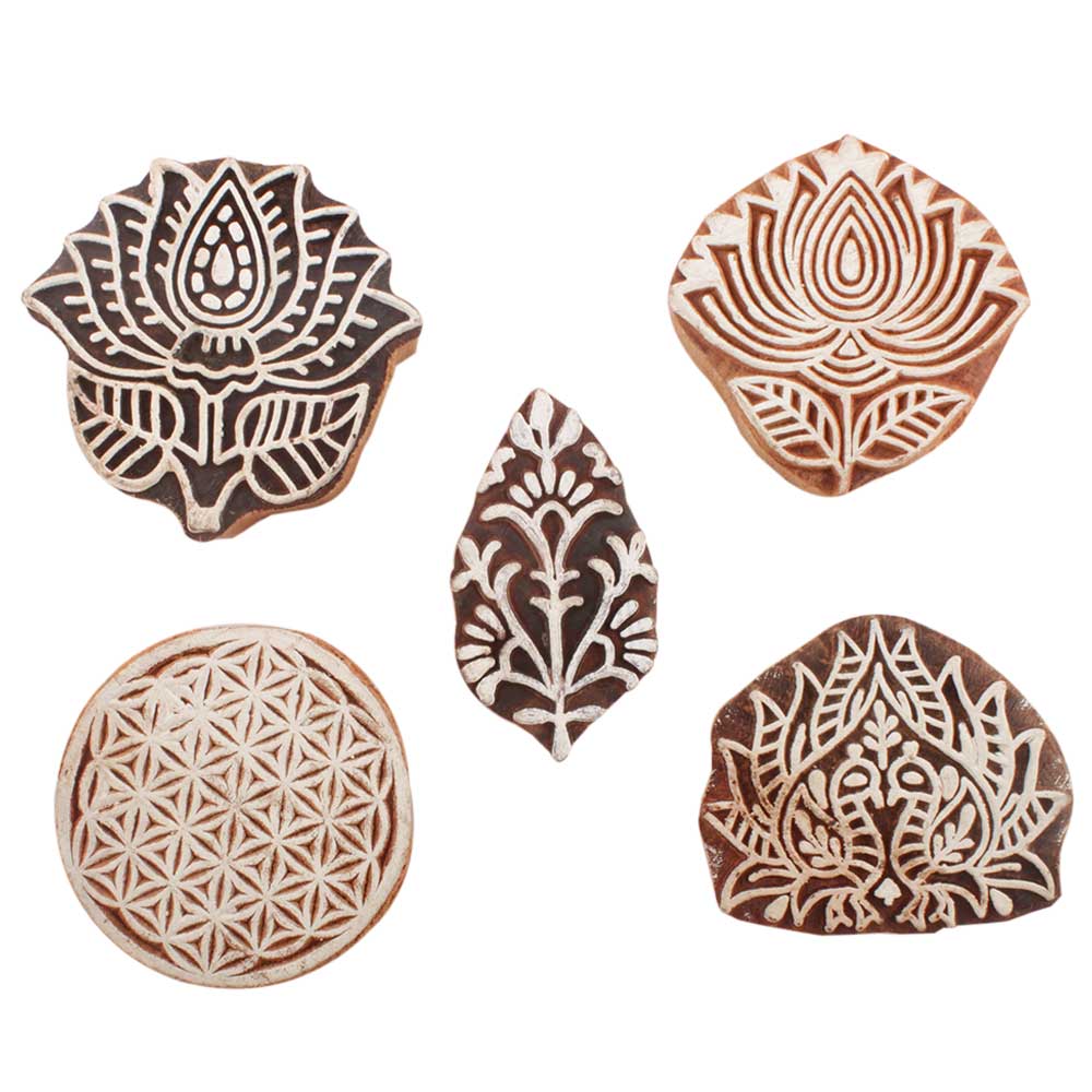 Set of 5 Piece New Mix Wooden Printing Blocks. Ideal for use on Fabric, Paper, Canvas, etc. These Blocks can be use to Print with Oil Colors, Fabric Colors, Water Colors, Acrylic Colors and Vegetable Colors.
