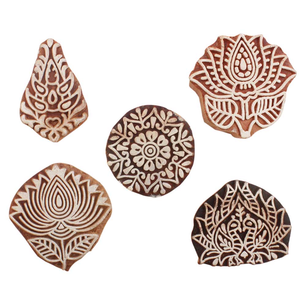 Set of 5 Piece New Mix Wooden Printing Blocks. Ideal for use on Fabric, Paper, Canvas, etc. These Blocks can be use to Print with Oil Colors, Fabric Colors, Water Colors, Acrylic Colors and Vegetable Colors.