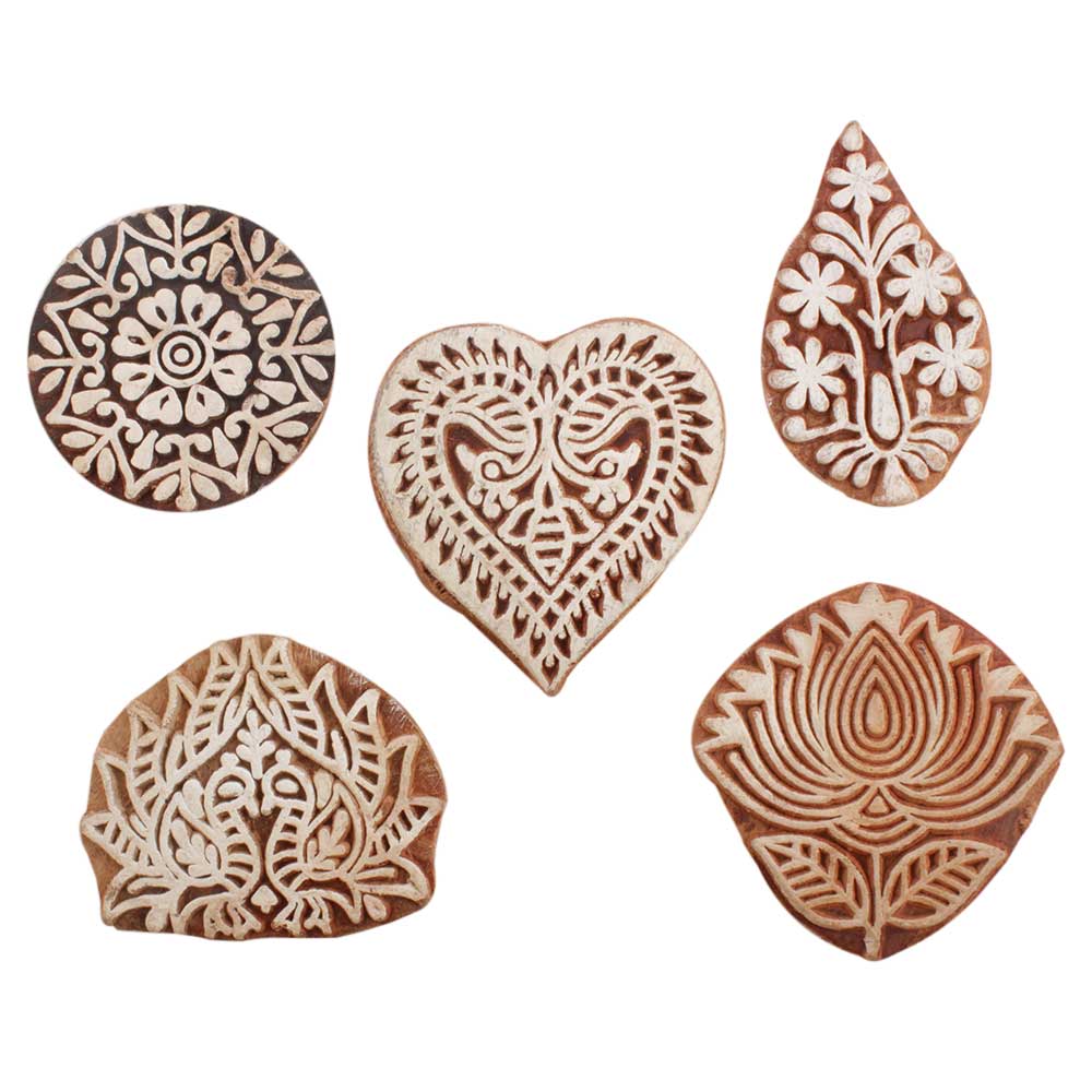 Set of 5 Piece New Mix Wooden Printing Blocks. Ideal for use on Fabric, Paper, Canvas, etc. These Blocks can be use to Print with Oil Colors, Fabric Colors, Water Colors, Acrylic Colors and Vegetable Colors.