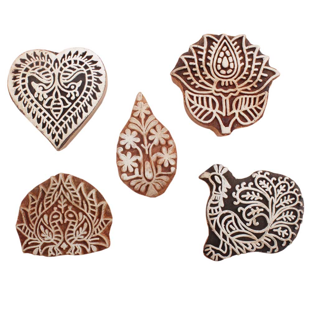 Set of 5 Piece New Mix Wooden Printing Blocks. Ideal for use on Fabric, Paper, Canvas, etc. These Blocks can be use to Print with Oil Colors, Fabric Colors, Water Colors, Acrylic Colors and Vegetable Colors.
