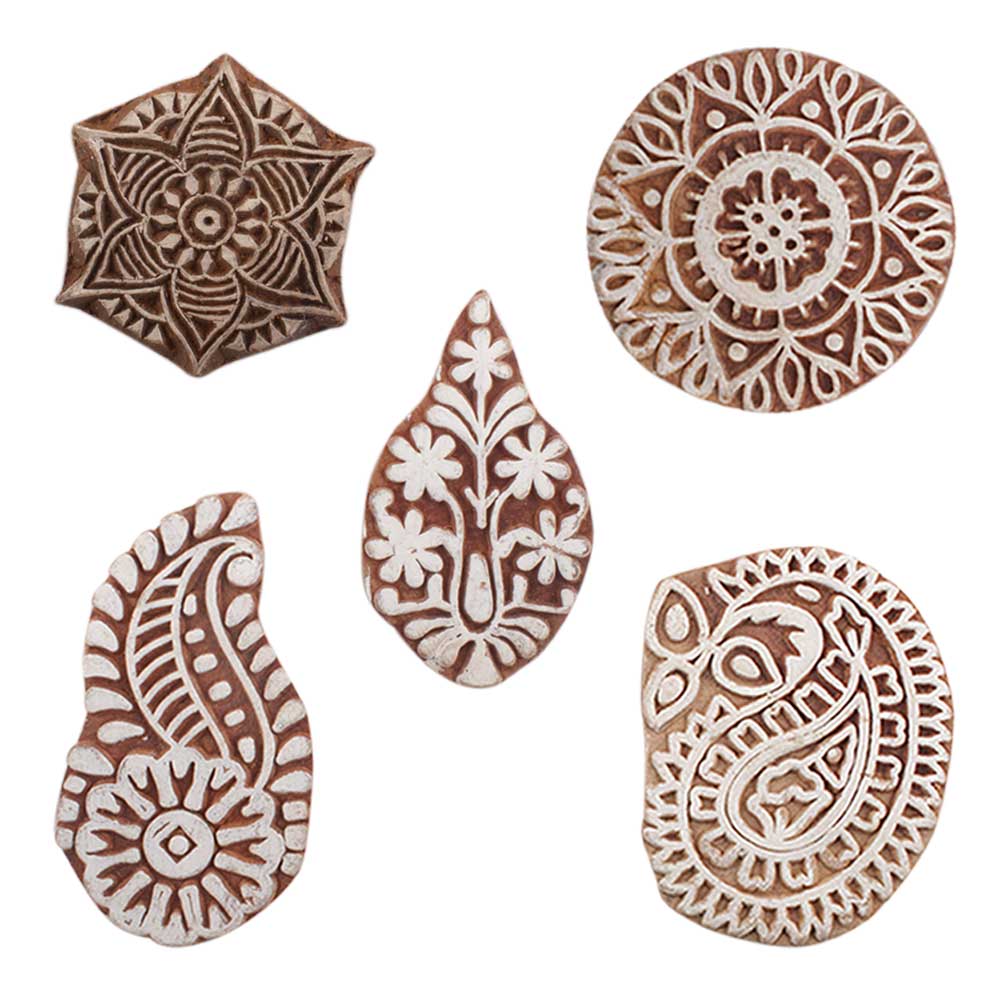 Set of 5 Piece New Mix Wooden Printing Blocks. Ideal for use on Fabric, Paper, Canvas, etc. These Blocks can be use to Print with Oil Colors, Fabric Colors, Water Colors, Acrylic Colors and Vegetable Colors.