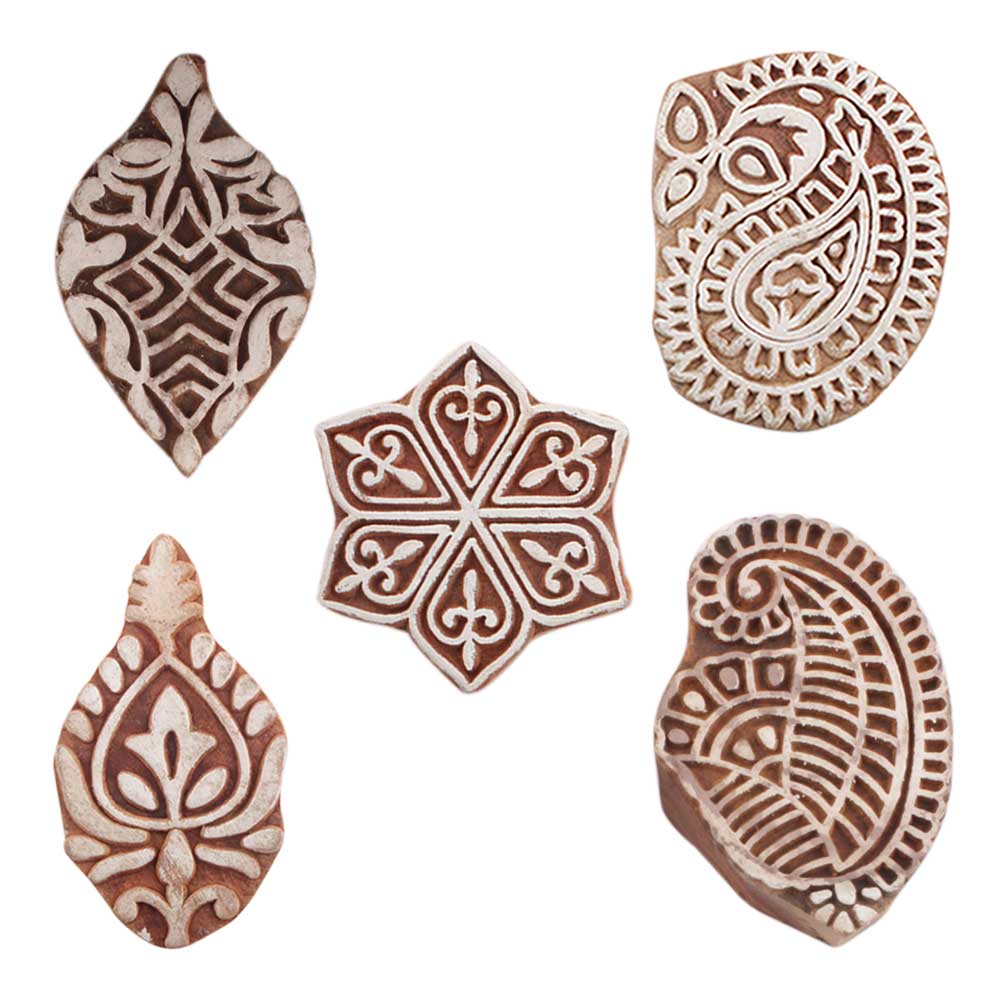 Set of 5 Piece New Mix Wooden Printing Blocks. Ideal for use on Fabric, Paper, Canvas, etc. These Blocks can be use to Print with Oil Colors, Fabric Colors, Water Colors, Acrylic Colors and Vegetable Colors.