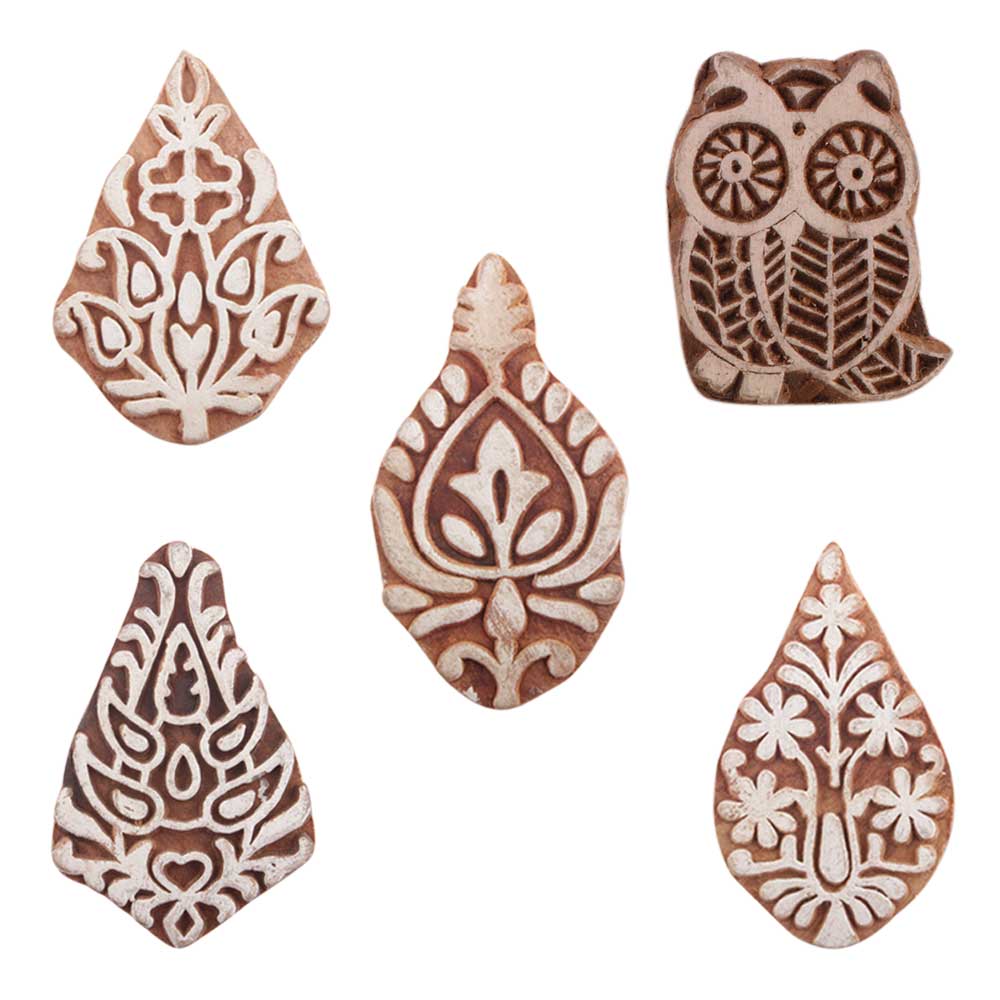 Set of 5 Piece New Mix Wooden Printing Blocks. Ideal for use on Fabric, Paper, Canvas, etc. These Blocks can be use to Print with Oil Colors, Fabric Colors, Water Colors, Acrylic Colors and Vegetable Colors.