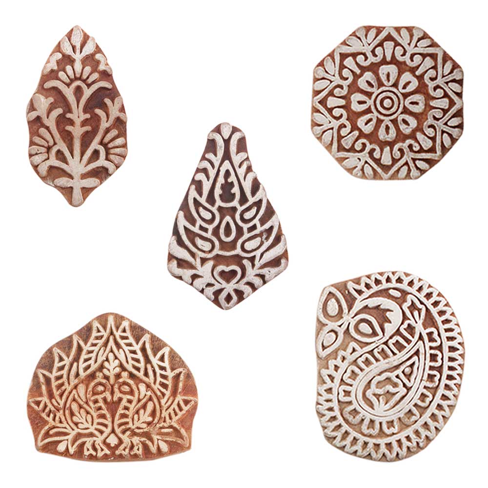 Set of 5 Piece New Mix Wooden Printing Blocks. Ideal for use on Fabric, Paper, Canvas, etc. These Blocks can be use to Print with Oil Colors, Fabric Colors, Water Colors, Acrylic Colors and Vegetable Colors.