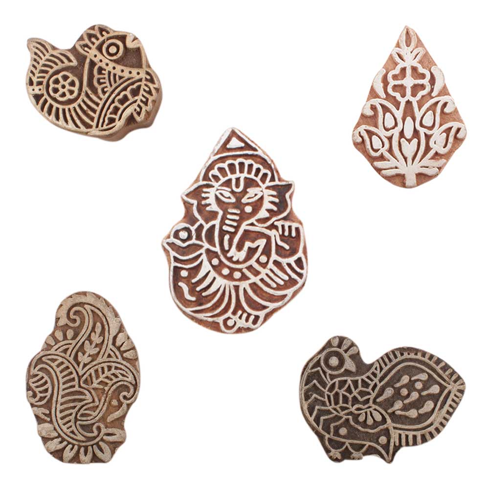 Set of 5 Piece New Mix Wooden Printing Blocks. Ideal for use on Fabric, Paper, Canvas, etc. These Blocks can be use to Print with Oil Colors, Fabric Colors, Water Colors, Acrylic Colors and Vegetable Colors.