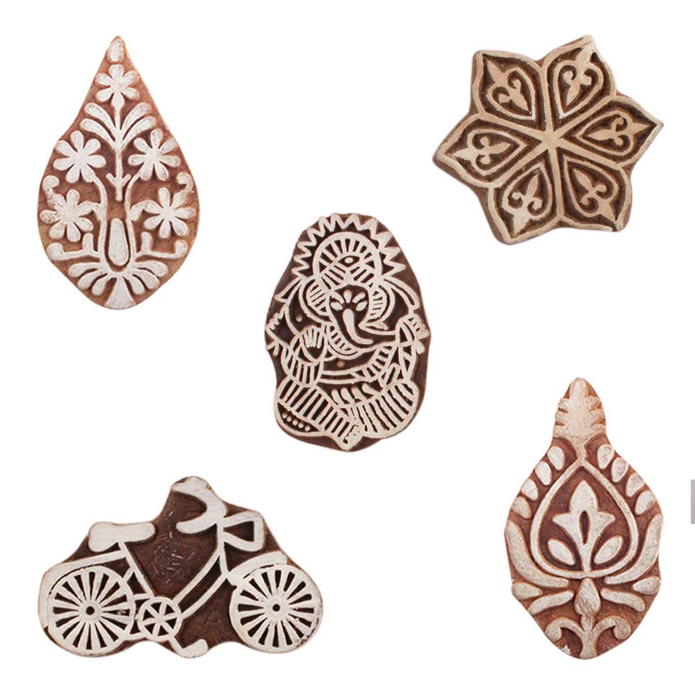 Set of 5 Piece New Mix Wooden Printing Blocks. Ideal for use on Fabric, Paper, Canvas, etc. These Blocks can be use to Print with Oil Colors, Fabric Colors, Water Colors, Acrylic Colors and Vegetable Colors.