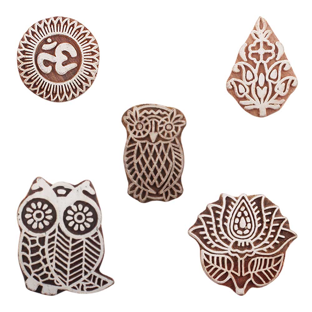 Set of 5 Piece New Mix Wooden Printing Blocks. Ideal for use on Fabric, Paper, Canvas, etc. These Blocks can be use to Print with Oil Colors, Fabric Colors, Water Colors, Acrylic Colors and Vegetable Colors.