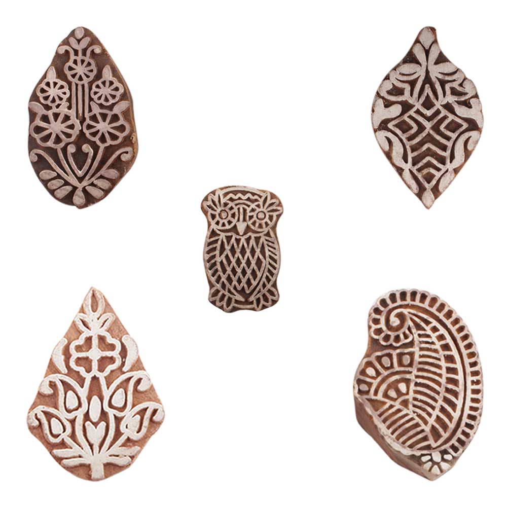 Set of 5 Piece New Mix Wooden Printing Blocks. Ideal for use on Fabric, Paper, Canvas, etc. These Blocks can be use to Print with Oil Colors, Fabric Colors, Water Colors, Acrylic Colors and Vegetable Colors.